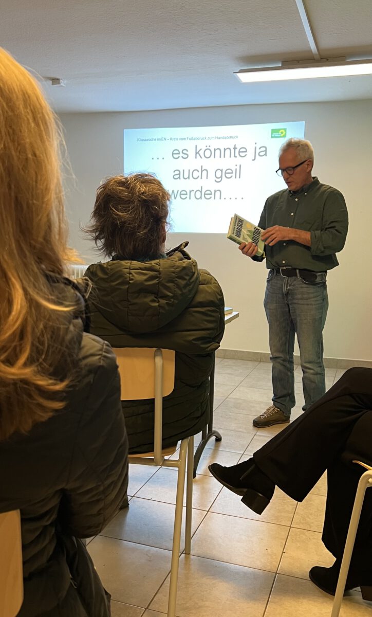 Im Rahmen der Klimawoche des EN-Kreises haben wir am 30.10. zum Vortrag „Klima retten – warum und wie geht das? Vom Fußabdruck zum Handabdruck“ eingeladen, zu dem wir einige interessierte Bürger aus Breckerfeld und Umgebung begrüßen durften. Der Vortrag gliederte sich in zwei Teile: