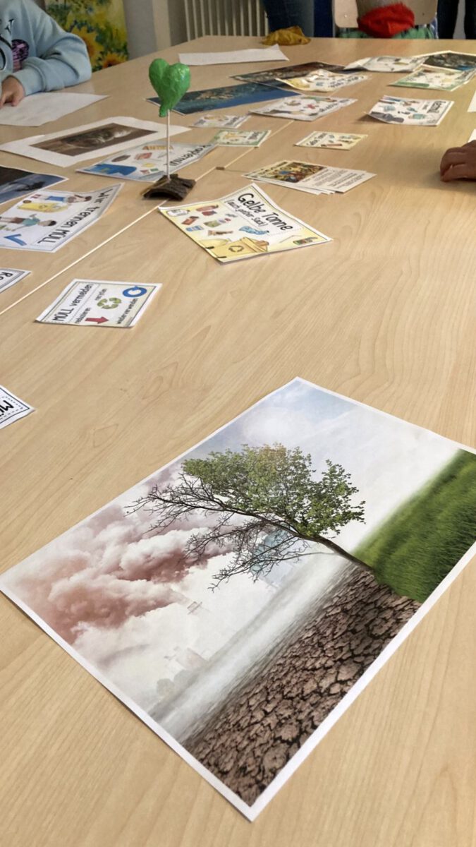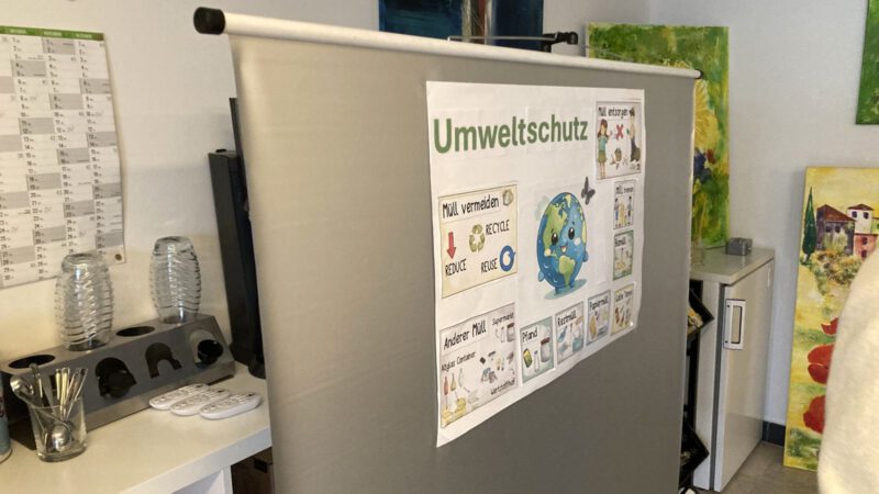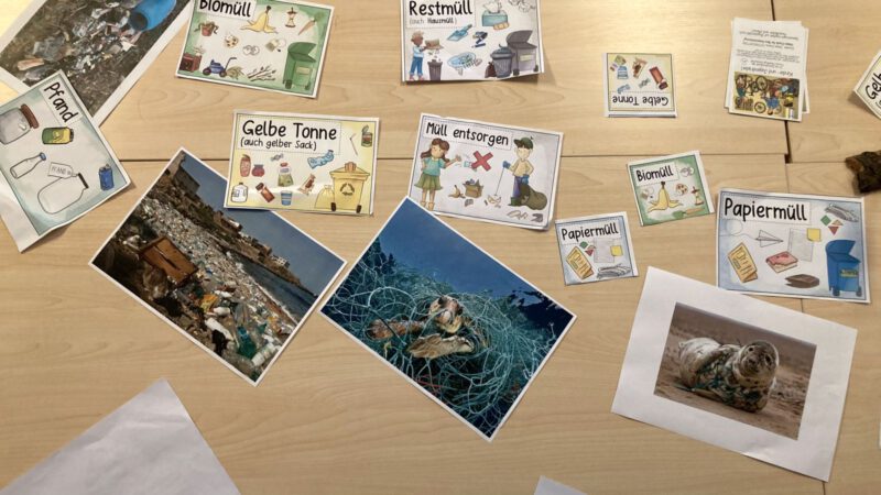 Der Vortrag war kurz und knackig, ganz auf das junge Publikum abgestimmt. Maja und ihre Freundin Lenia erklärten, was falsch laufe: „Die Tiere fressen Müll und sterben“ – eindrückliche Bilder dazu lagen bereits auf den Tischen. Steffen Wiesendt, der nicht nur diese Veranstaltung begleitet, sondern jüngst auch den Verein bzw. das Projekt HerzwertRaum e.V. in Hagen genau für solche Projekte mitgegründet hat, ergänzte an der einen oder anderen Stelle – beim Konzept „Reduce, Reuse, Recycle“ konnte er den Anwesenden zeigen, dass Müllsammeln nicht das Einzige ist, was gegen das Müllproblem hilft.